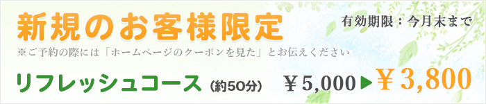 初回 リフレッシュコース(50分コース)の場合、初回は検査などが多いので70分〜80分くらい。2回目からは60分〜70分くらいをみておいてください。